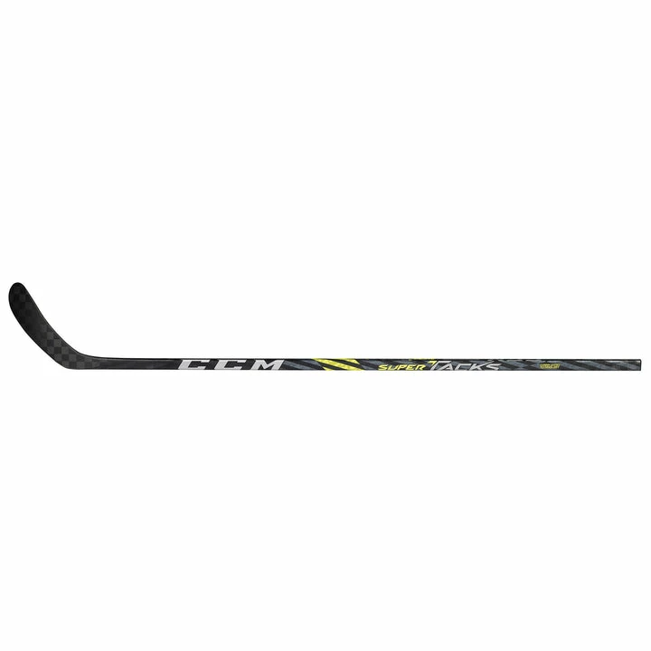 The CCM Super Tacks AS4 Grip Senior Hockey Stick stays true to the Tacks family graphics with a black base, and yellow/chrome accents throughout.